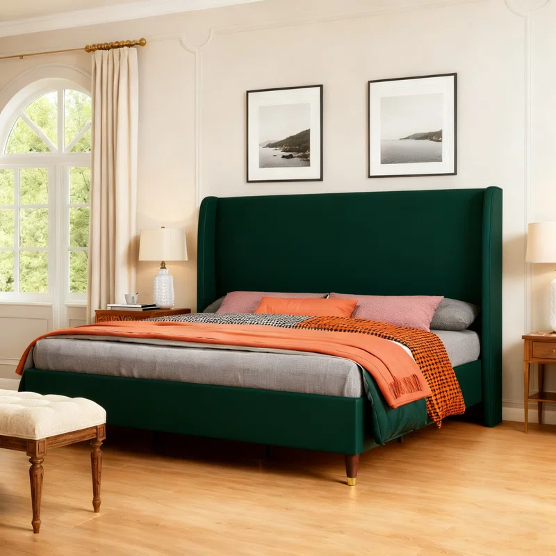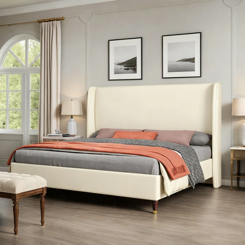 Finition premium en tissu beige, parfaite pour les chambres contemporaines. -